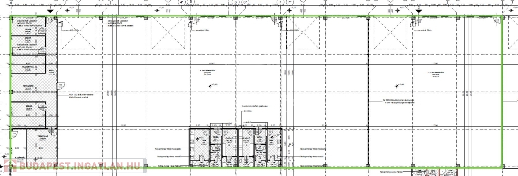Elosztását tekintve egy csarnoktérből (773m2), egy 111m2-es, 4-5 helyiséges irodablokkból és két darab, egyenként 32m2-es öltözőkkel, teakonyhával és mosdókkal felszerelt szociális blokkból áll.