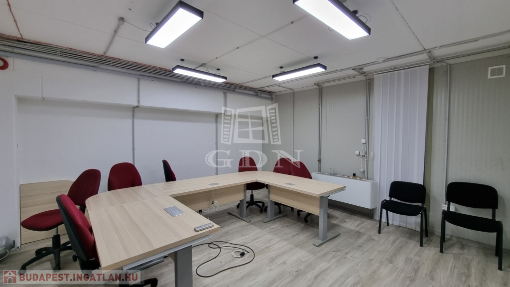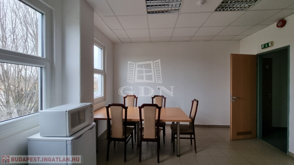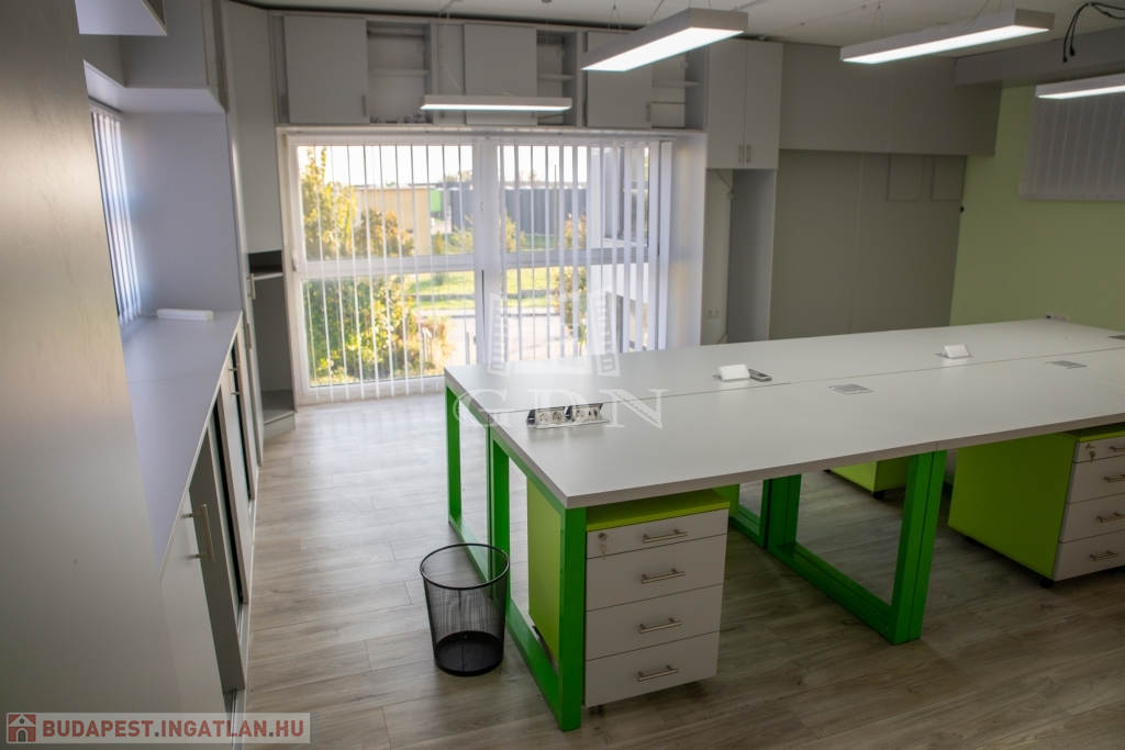 A csarnokhoz bérelhető egy újszerű állapotú, első emelti, klímás, 45 m2-es irodahelyiség közös használatú WC/mosdóval és teakonyhával. Igény esetén tárgyalóhelyiség is bérelhető.