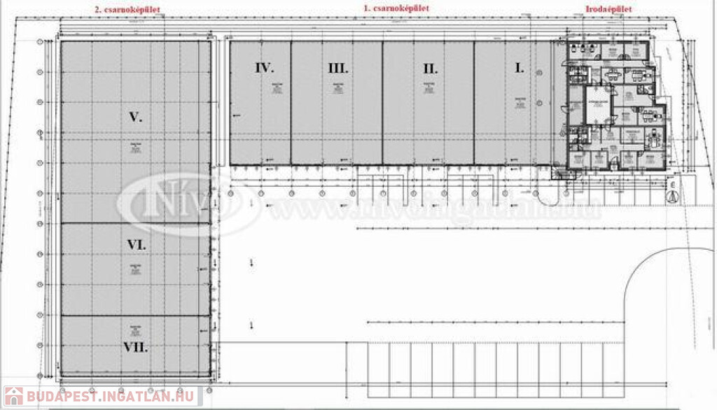 Terület: 8200 m2-es bekerített, összközműves, parkosított, térkövezett, felszíni parkolókkal ellátott.