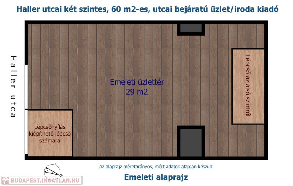 A 31 m2-es földszinten UTCÁRÓL NYÍLÓ, VILÁGOS ÜZLETHELYISÉG, valamint egy teakonyha és mosdó áll rendelkezésre. A 29 m2-es, szintén ablakos felső szintre – az alaprajz szerinti kiépítésben – belső lépcső vezet, mely akár az üzlet elejébe is áthelyezhető.