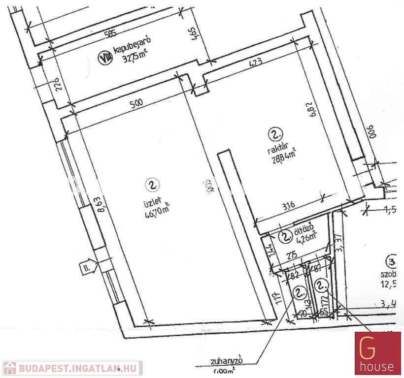Helyiségek: eladótér, kézmosó, WC, zuhanyzó, kb. 8 m²-es raktár