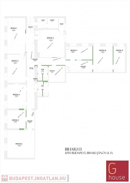 9 iroda, telekommunikációs szoba, felszerelt teakonyha, tágas közlekedőterek, valamint külön női és férfi mosdó található. A 13-34 m2 alapterületű irodák bútorozottan vagy bútorozatlanul is bérbe vehetők.