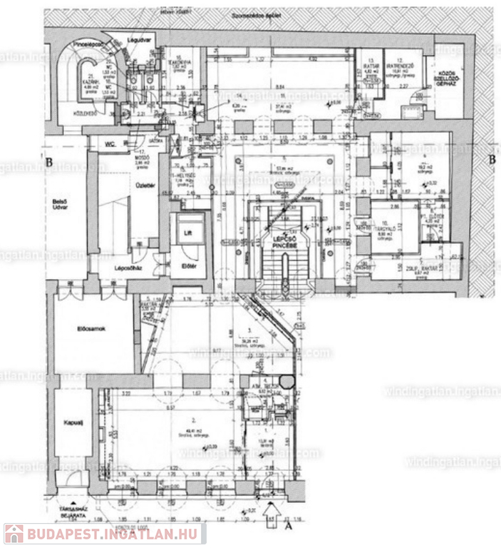 Igény esetén 639 nm-es pinceterület is hozzábérelhető, melynek lejárata az üzlettérből közelíthető meg. Amennyiben erre nincs szükség, ez a terület lezárható. A pince is padlólapos, korábban üzlethelyiségek üzemeltek itt is, egybefüggő nagy területek is kialakíthatók.
