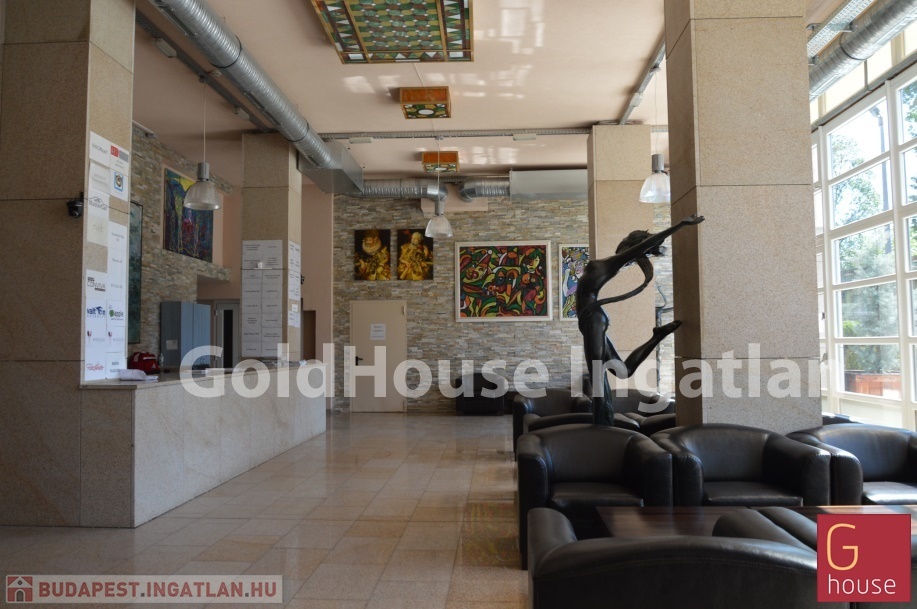 A 6 méter belmagasságú aula művészeti galériaként is szolgál; kortárs magyar festők képei díszítik a falakat.