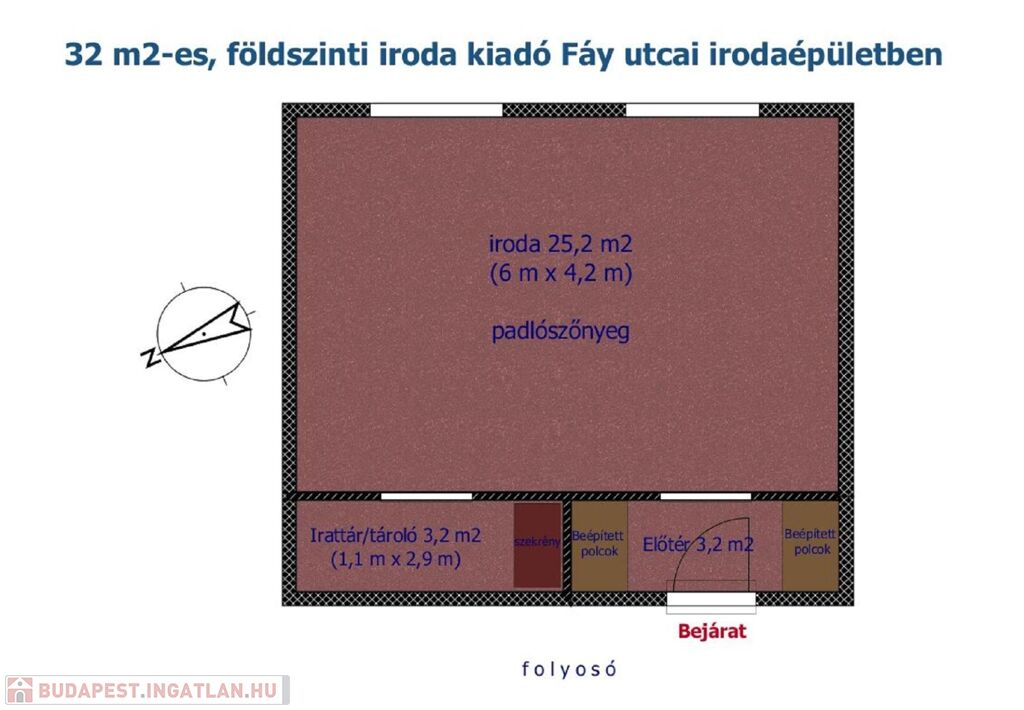 Az alaprajzon látható elrendezésben áll egy irodahelyiségből, egy előtérből, ahol beépített polcok segítenek abban, hogy az iroda rendezettek maradjon, valamint egy további, irattárnak, tárolónak alkalmas kis helyiségből.
