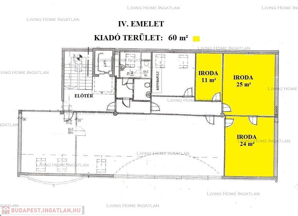 A teljes szinten belül egy vagy több iroda is bérelhető: 60 m2, 130 m2, 166 m2, 202 m2 terület.