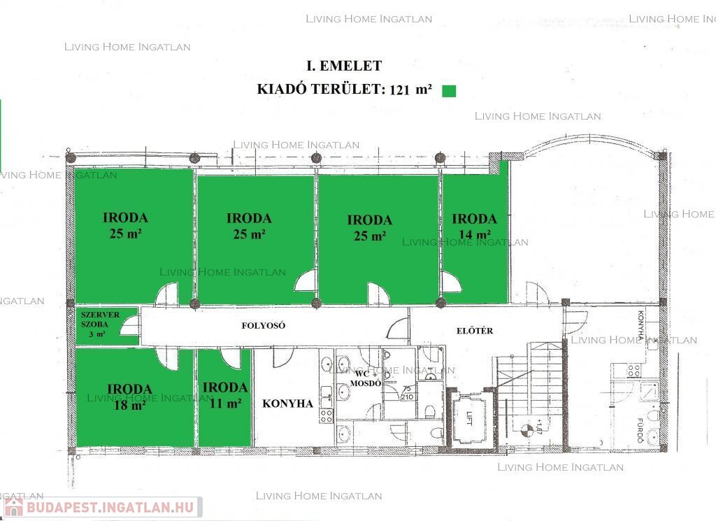 A teljes szinten belül egy vagy több iroda is bérelhető: 36 m2, 64 m2, 100 m2, 121 m2 terület.
