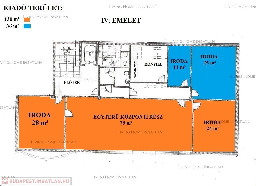 A teljes szinten belül egy vagy több iroda is bérelhető: 60 m2, 130 m2, 166 m2, 202 m2 terület.