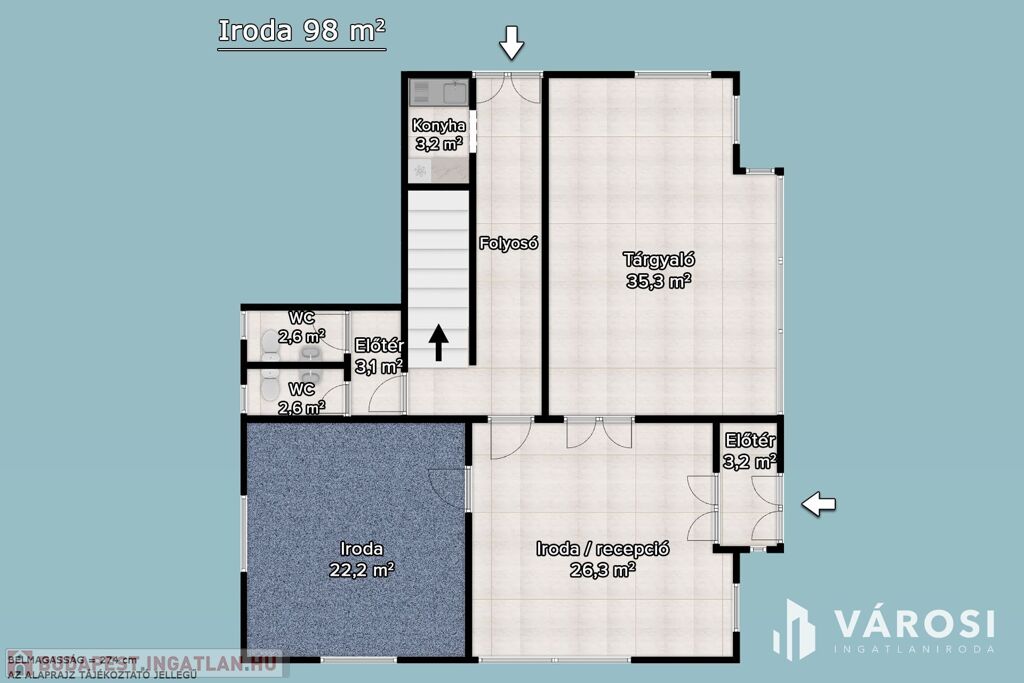 Ezen kívül saját konyhával és 2 db WC-vel is rendelkezik, összesen 98 m2. Az iroda 8-12 fő részére ideális méretű.
