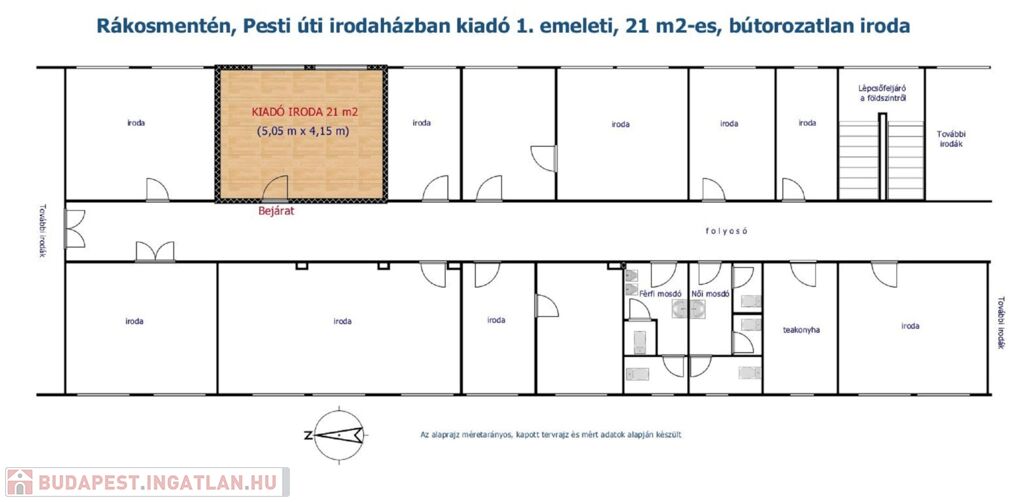 Az iroda egyetlen helyiségből áll, elhelyezkedése az alaprajz szerinti, bútorozatlanul kerül kiadásra.