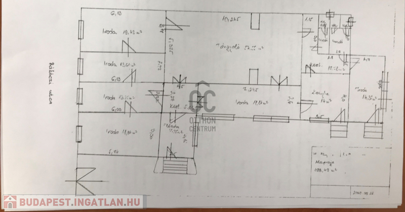 Fűtése gázkonvektor. Helyiségei: 19 m2, 13 m2, 13 m2, tárgyaló 54 m2 illetve fürdőszoba-wc, teakonyha és előtér.