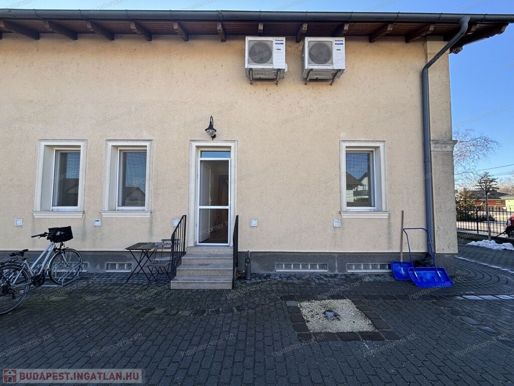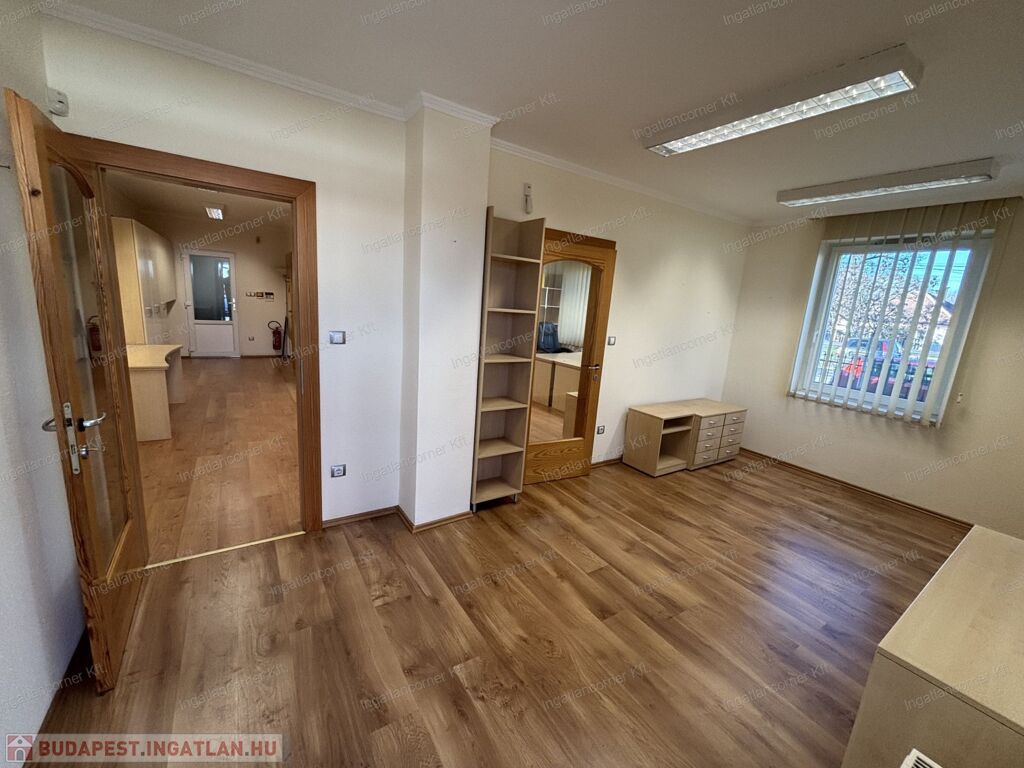 Az iroda 4-6 fő részére alkalmas, elosztása egy nagyobb irodarészből, egy vezetői helyiségből, konyhából, 2db mosdó helyiségből és 2db WC-ből áll. Két bejárata van, az egyik az irodaházból, a másik az udvarról.