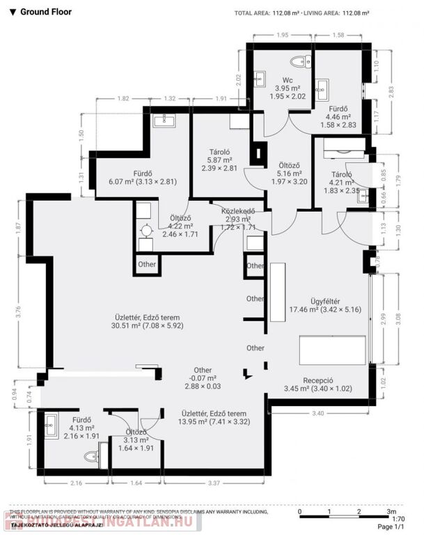 Az üzletbe cirk. 18 m2-es ügyfélfogadóba érkezünk, ahonnan nyílik a fő helyiség az üzlettér, ami cirk. 45 m2-es. Ezen kívül három zuhanyzó és ezekhez kapcsolódó öltözők és tárolóhelyiségek alkotják a 112 m2-es ingatlant.