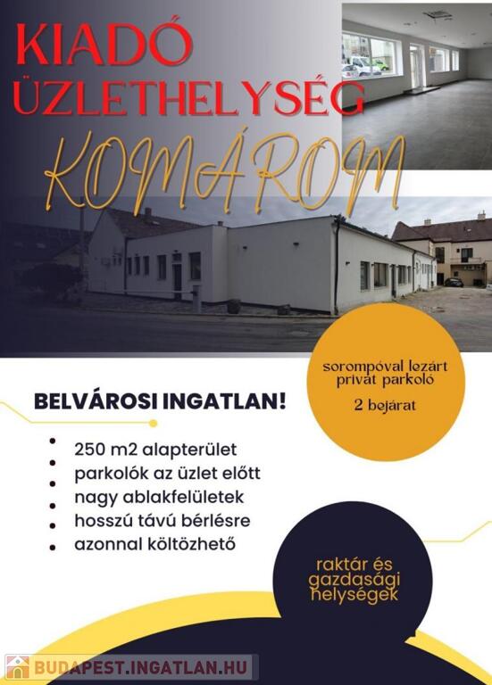 Kiadásra kínálunk Komárom frekventált részén (közelben Duna áruház, számos üzlet, iskola,egyég intézmények) egy 250nm-es teljes körűen FELÚJÍTOTT üzlethelyiséget (üzlet+ raktártér)