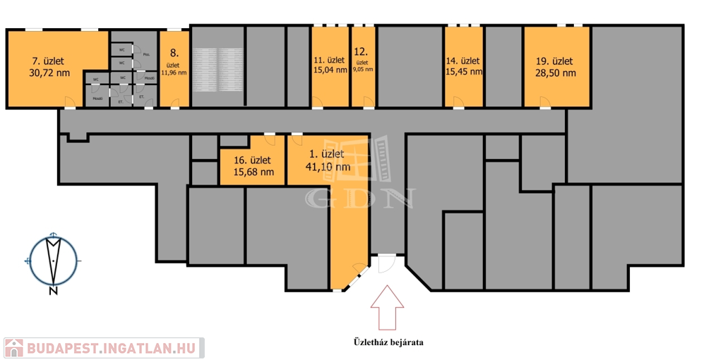 Földszinti elérhető szabad üzletek méretei: