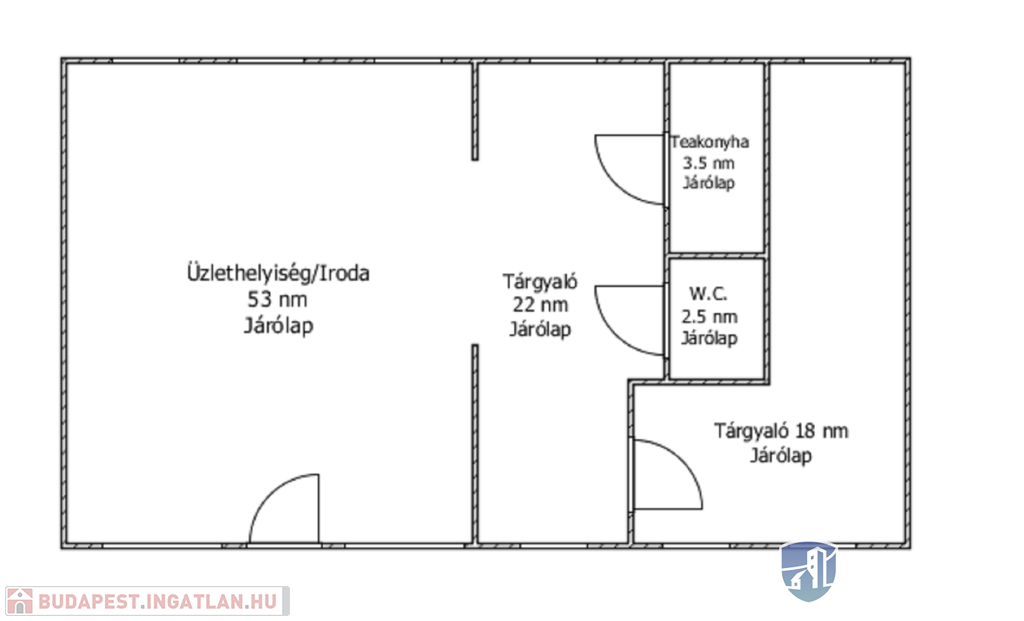 A helyiség alkalmas lehet irodaként történő használatra, hiszen jelenleg elszeparált tárgyaló, teakonyha és önálló vizesblokk található benne.