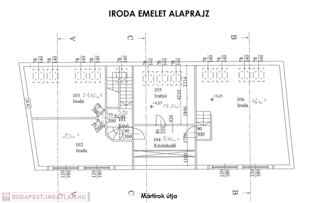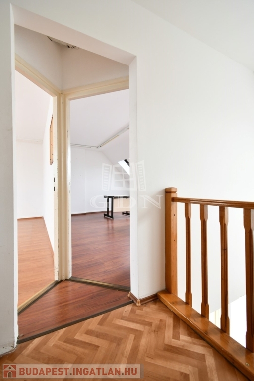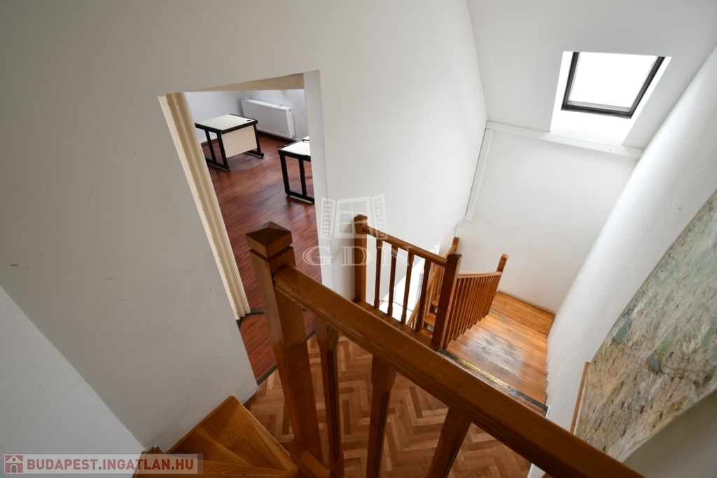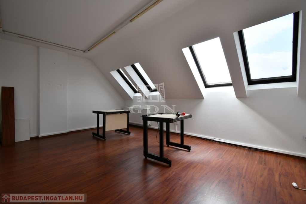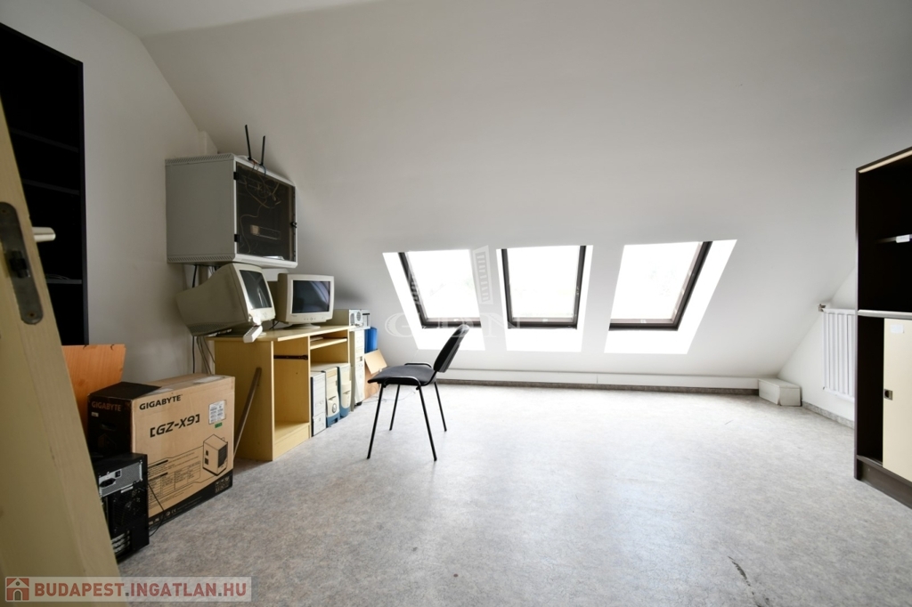 ‣ elosztását tekintve a földszinten egy iroda / üzlethelyiségből, teakonyhából, női/férfi wc-ből, és egy zuhanyzós mosdóból, a tetőtérben pedig 3db irodából és egy irattárból áll
