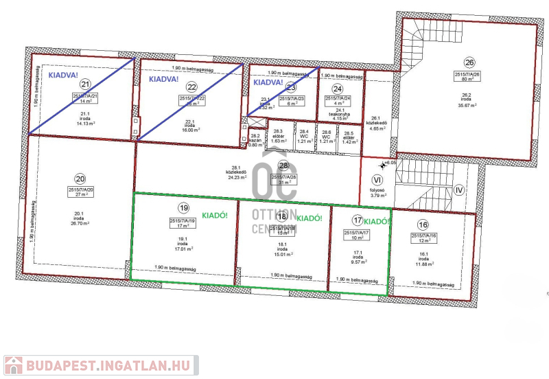 - A hirdetésben található iroda 42 m2 alapterületű, a szintrajzon a 17, 18, 19. számú együtt.