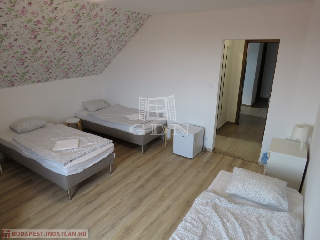 A kétszintes épület emeleten négy (2db 4 ágyas és 2db 3 ágyas), önálló fürdőszobás apartman, illetve egy teakonyha került kialakításra.