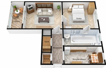 A lakás elrendezése kiváló: a két szobán kívül egy tágas előszoba-közlekedő, tároló, kamra, konyha-étkező, valamint fürdőszoba WC-vel is helyet kapott. Az erkélyről és az ablakokból minden irányba szép panoráma nyílik a városra.