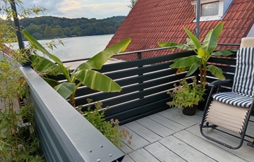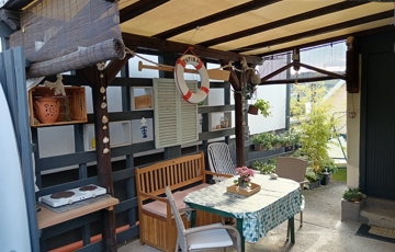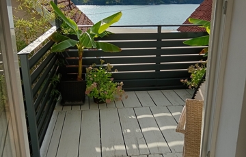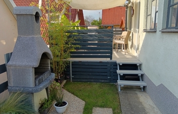 A 80 m²-es telek igényesen és praktikusan lett kialakítva. A tóra néző, tágas terasz nyugodt pihenést kínál, ezen kívül fedett terasz, tároló, hintaágy és kemence is található rajta – utóbbiak igény szerint megvásárolhatók.