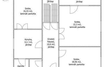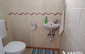 A felső szinten 100 m2-es, három szobás lakás van konyhával, nagy konyhai tárolóhelyiséggel, fürdőszobával, külön WC-vel, és egy nagy erkéllyel.