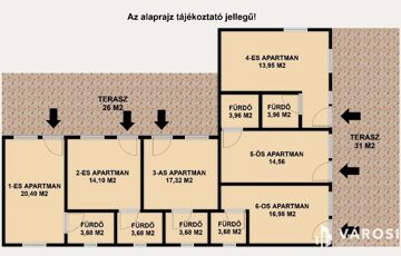 - Apartmanok száma: 6 teljes értékű, külön bejáratú apartman