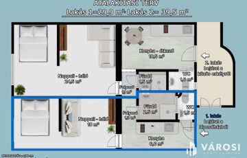 Lakótér: 70 m², elrendezése: 1 nappali, 1 hálószoba, konyha, külön fürdő és WC, kamra, 2 bejárat.