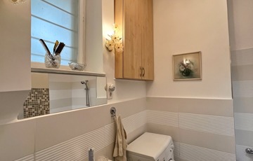 A fürdőszoba kifogástalan állapotú, kényelmes káddal felszerelt.