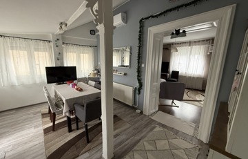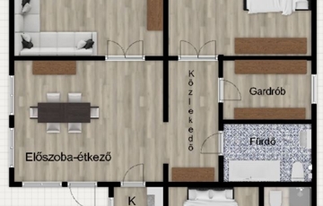 A nagyobb 90 m2-es házban három szoba (hűtő-fűtő klímával felszerelt) , előszoba-étkező, konyha, közlekedő és gardrób helyiség került kialaításra. Két fürdőszoba szolgálja a lakók kényelmét – az egyik zuhanyzós, a másik kádas –mindkettő felújított. Minden helyiség modern burkolatot kapott.