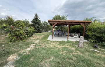Az udvar minden szempontból jól átgondolt: térkövezett, rendezett, akár autó számára is biztosít parkolást. Egy 25 m²-es, fedett kiülő teremt kellemes, árnyékos pihenőhelyet, emellett fa tároló gondoskodik a kerti szerszámok és kerékpárok elhelyezéséről, valamint a ház alatt egy 12 m2-es pince is megtalálható.