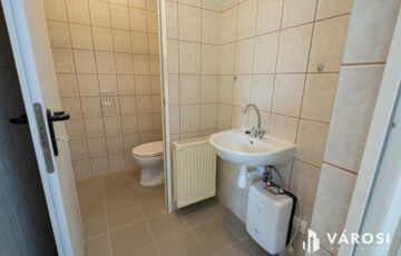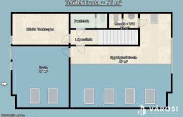 Az irodaterület 2 részből áll, egy vezetőségi irodából és egy egylégterű irodából. Ezen kívül saját mosdóval és WC-vel is rendelkezik, összesen 75 m2. Az iroda 8-10 fő részére ideális méretű.