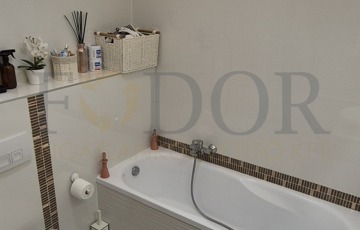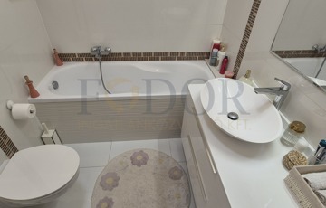 Az eredeti alaprajz szerint a lakás két fürdőszobával lett megtervezve, azonban a jelenlegi tulajdonosok a szülői hálószobához tartozó fürdőhelyiséget praktikus gardróbszobává alakították. A víz- és szennyvízkiállások azonban megmaradtak, így igény esetén a második fürdőszoba könnyedén visszaállítható.