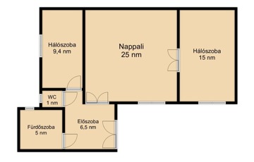 A lakásba lépve egy kényelmes méretű, parketta burkolatú, 6,5 nm-es előszobába jutunk. Innen érhetők el jobb kéz felé a szobák, szemben pedig a fürdő és a toalett. Az előtérből közvetlen jobbra az amerikai konyhás, nagyméretű, 25 nm-es, parketta burkolatú, klímás nappalit találjuk, melyből kétszárnyú ajtókapcsolattal a nagyobb, 15 nm-es hálószoba nyílik. A nappali mellett az előszobában, a szellőzőablakos toalett előtt belépve a kisebbik, 9,4 nm-es, szintén parkettázott, klimatizált másik hálószobát találjuk. Végül az előszobában a bejárattal szemben érhető el az 5 nm-es, járólappal és csempével burkolt, viszonylag tágas, szellőzőablakos fürdőszoba.