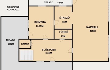 A házba a kis teraszon keresztül jutunk, és a házba lépve tágas előszoba fogad minket. A földszinten jobb kéz felé haladva a 46nm-es világos, nappali található, mely alkalmas nagy családi összejövetelekre, vagy társaság fogadására is. A nappaliból nyílik az étkező, mely kijárattal rendlkezik a konyhába. A konyha is nagy térrel rendelkezik, 2 bejárattal, az előtérből és étkezőből is megközelíthető. Kijárata van a teraszra.
