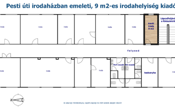 A 9 m2-es iroda bérleti díja 26.100 forint + Áfa/hó, mely nem tartalmazza a nm-arányosan leosztott rezsiköltségeket.