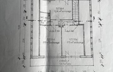 Emelet: 2 szoba, étkező, konyha, kamra, kádas fürdőszoba + mellékhelyiség, erkély.