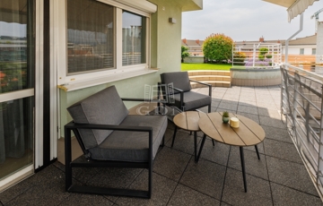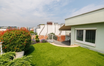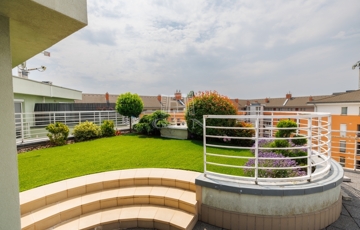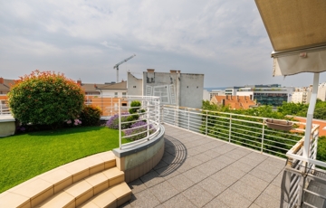 A lakáshoz tartozó, 83 nm-es különleges tetőkert és terasz a kert nyugalmát és a városi élet exkluzivitását ötvözi – fűnyírás és gondozás nélkül.