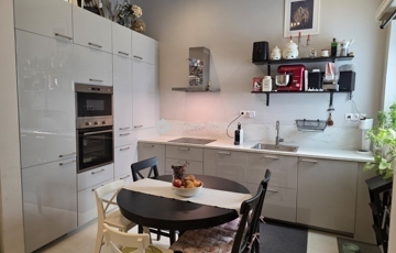 A vételár részét képezi a beépített gépesített konyhabútor, a biokandalló és a méretre készített beépített szekrények a nappaliban.