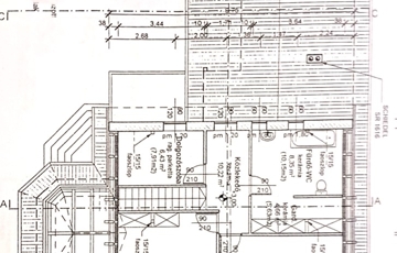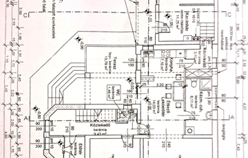 wc (1,49m2), nappali (20m2) - étkező (14,03m2) - konyha (7,1m2), speiz (3,83m2), kazánház (11,25m2), tároló (12,2m2) fürdő (8,11m2), terasz (19,79m2).