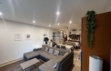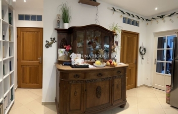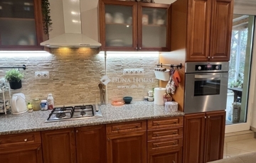 A nappali – konyha – étkező csaknem 40 m2-es, közvetlen kijárattal a teraszra. Cseresznyefából készült beépített konyhabútorok rejtik a konyhai gépeket: kerámialapos tűzhely, toronyként épített sütő, mosogatógép, konyhai elszívó, méretes gránit előkészítő pult.