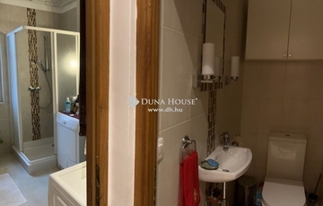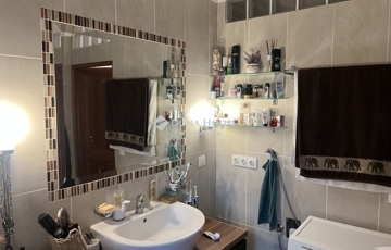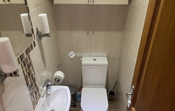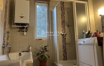 A káddal és zuhanykabinnal felszerelt, nagy ablakon szellőző fürdő kifejezetten tágas, elfér benne mosó- és szárítógép egyaránt; a wc önálló helyiségben kapott helyet.