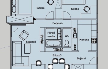 • Elrendezés: nappali + 2 külön nyíló szoba
