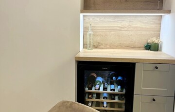 • Étkezőben egyedi borhűtő-beépítés és praktikus tárolófelületek