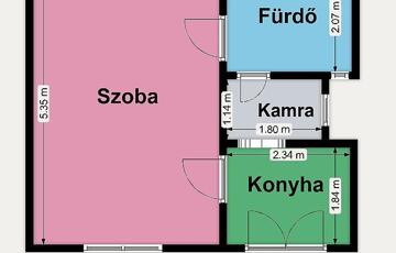 A lakás praktikus elosztású: egy szoba, konyha, fürdőszoba és kamra található benne.
