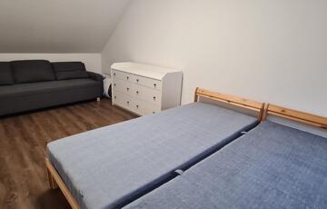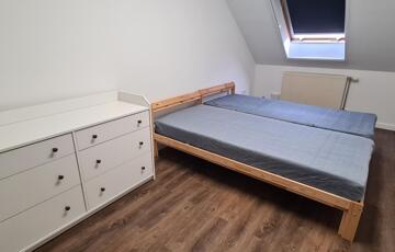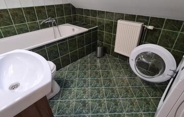 Az emeleti szinten egy franciaágyas szoba nappali sarokkal, egy további félszoba mely 1 db ággyal felszerelt, és további 1 szoba ahol szintén 2 ágy került elhelyezésre. Az emeleti szinten fürdőkádas fürdőszoba kapott helyet, mely mosógéppel felszerelt.