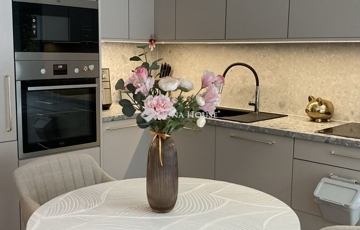 Nagy méretű, modern konyha AEG beépített gépekkel a vételár részeként. Számos beépített szekrény és rejtett tároló megoldás.