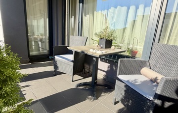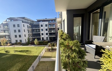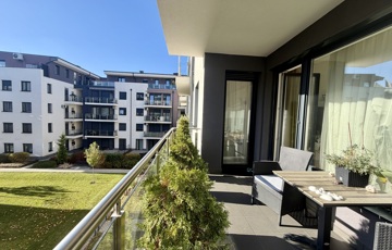 A hatalmas ablakfelületeknek köszönhetően a terek világosak, barátságosak, a nagy erkélyről pedig a parkosított, zárt udvarra nyílik kilátás – az üvegkorlát még inkább megnyitja a teret a természet felé.