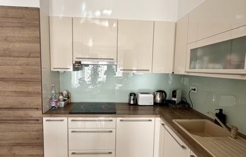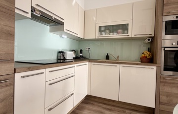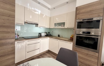 A belső terek egyedi megoldásokkal, minőségi anyagokkal készültek. Az egyedi tervezésű konyha beépített gépekkel (indukciós főzőlap, sütő, mikro, hűtő, fagyasztó, páraelszívó) a vételár részét képezi. A gardróbszoba mennyezetig érő szekrényekkel és tükörrel felszerelt – minden apró részlet a kényelmet szolgálja.