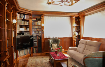 Beépített könyvtárszoba – tömör cseresznyefa polcrendszerrel, déli benapozással